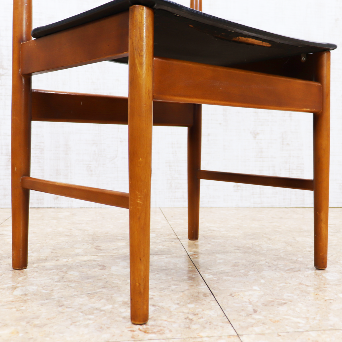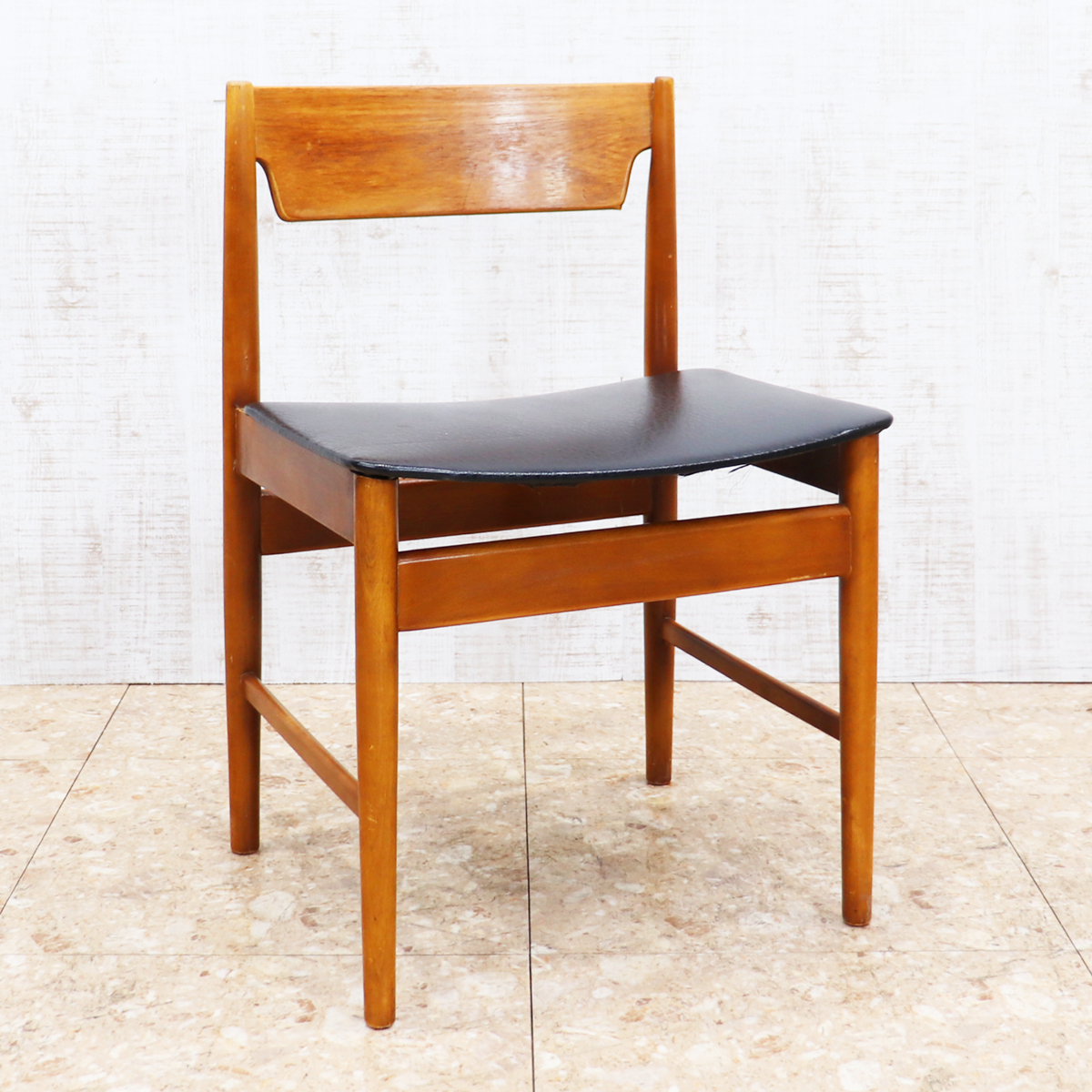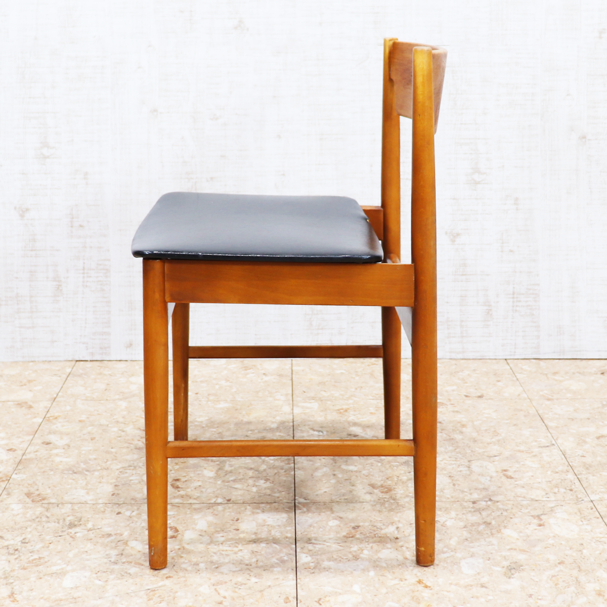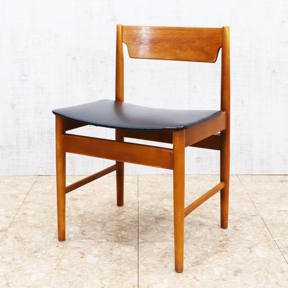 あたたかみのある木製フレームは、経年によって深みを増した色合いが魅力です。ブラックの座面とのコントラストが印象的で、ナチュラルインテリアや北欧スタイル、カフェ風の空間とも相性良く馴染みます。ダイニングチェアとしてはもちろん、デスクチェアやショップ什器、来客用チェアとしても活躍する一脚です。