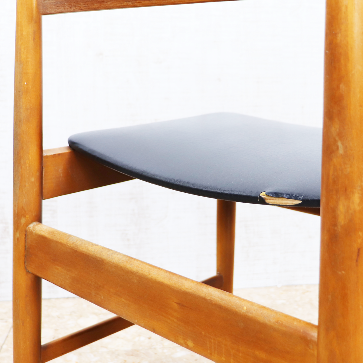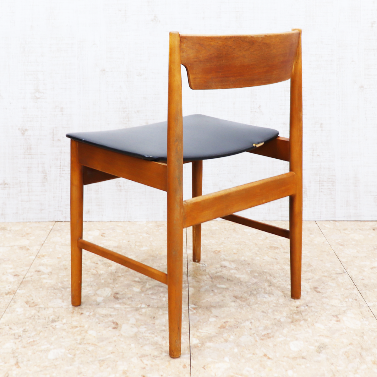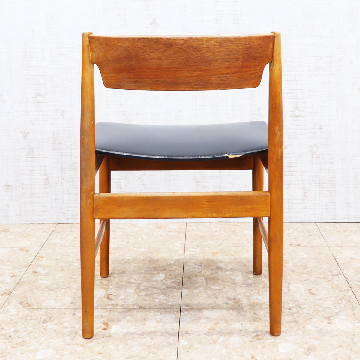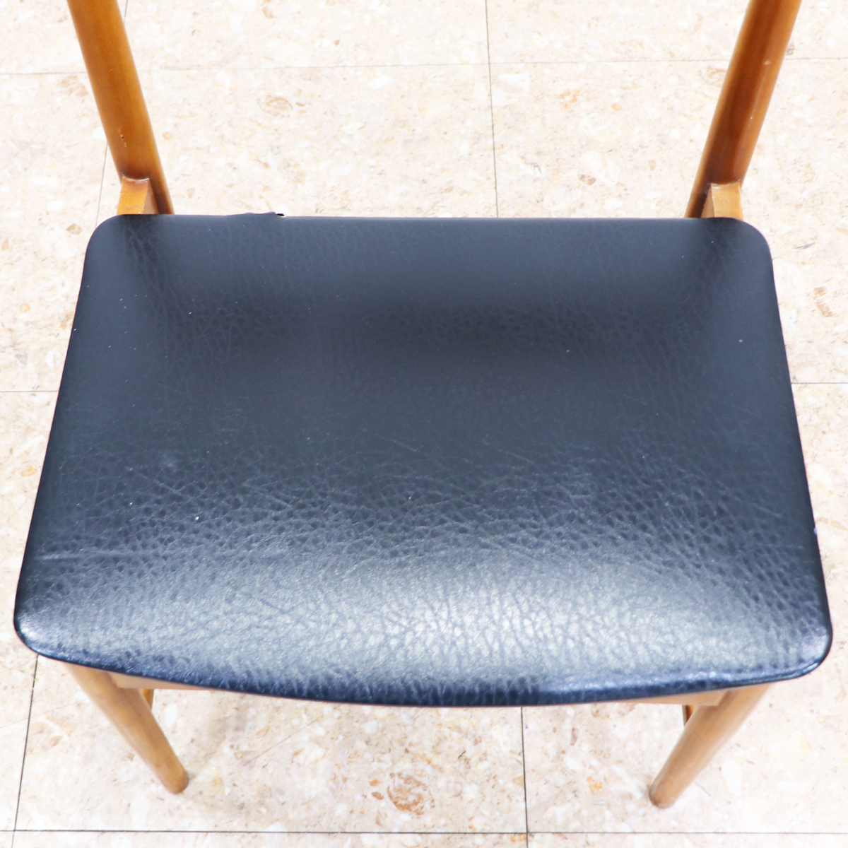 あたたかみのある木製フレームは、経年によって深みを増した色合いが魅力です。ブラックの座面とのコントラストが印象的で、ナチュラルインテリアや北欧スタイル、カフェ風の空間とも相性良く馴染みます。ダイニングチェアとしてはもちろん、デスクチェアやショップ什器、来客用チェアとしても活躍する一脚です。