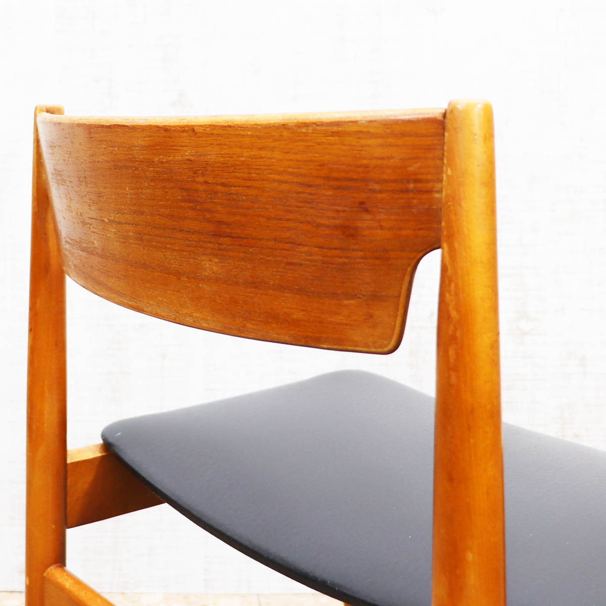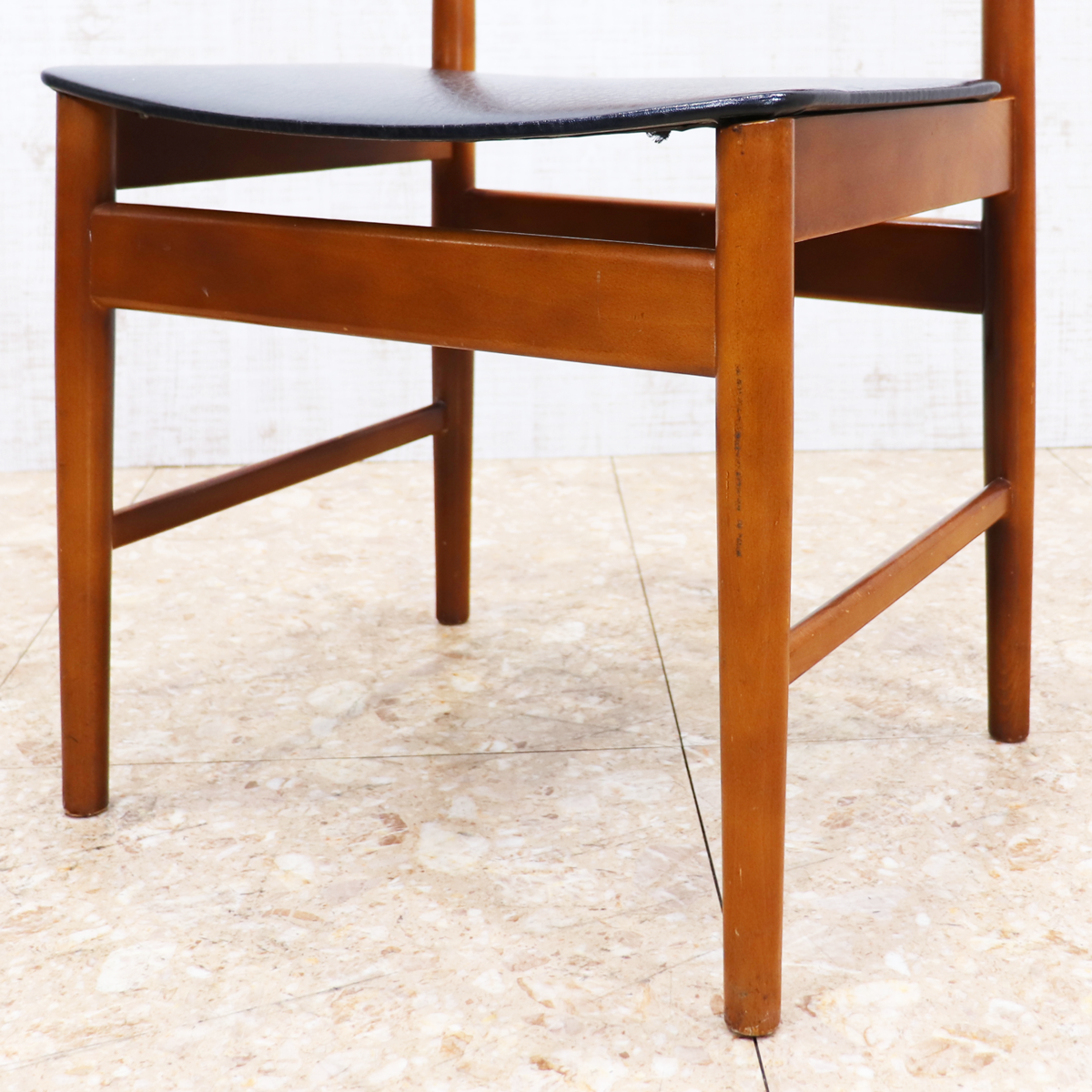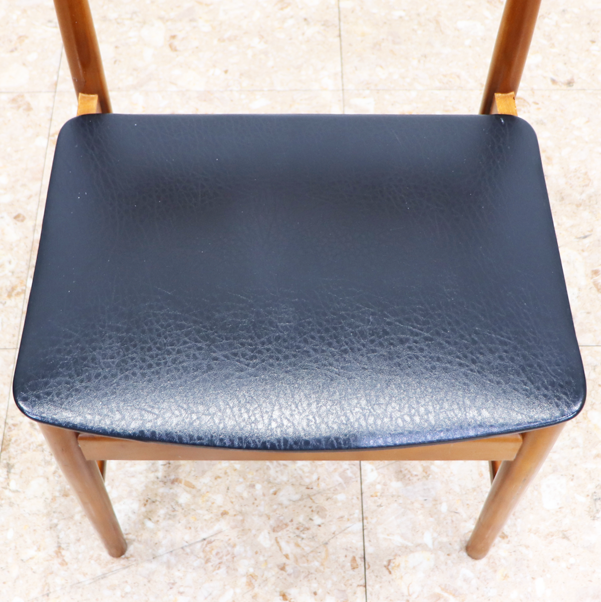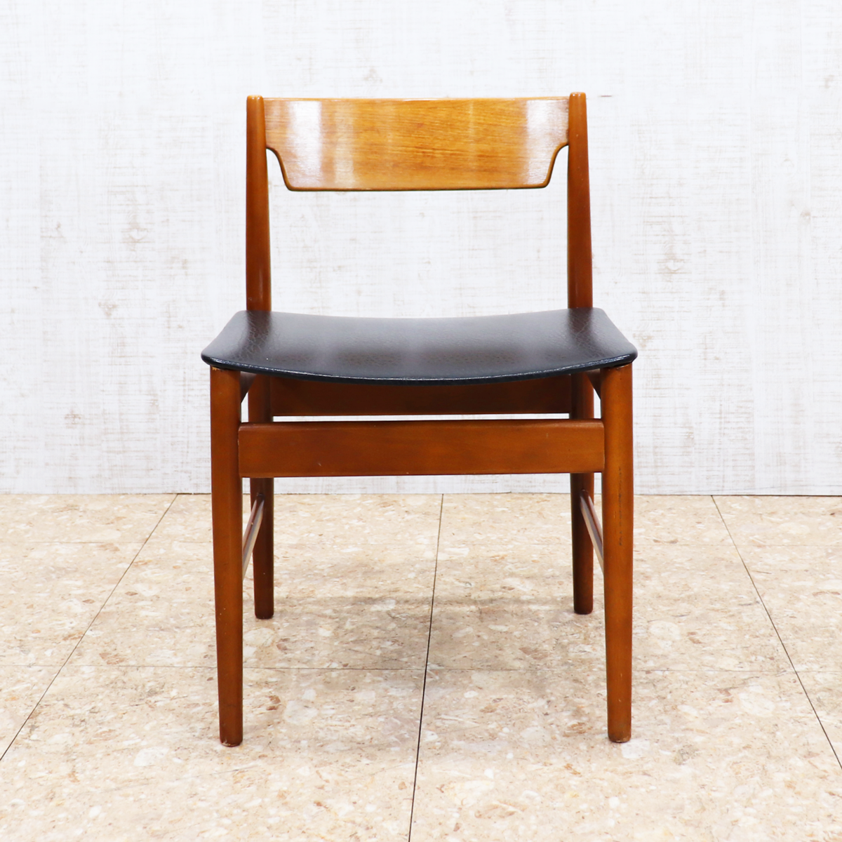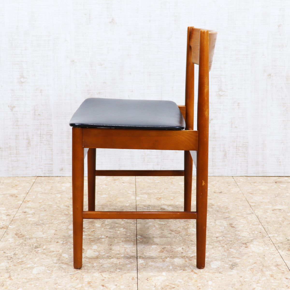 あたたかみのある木製フレームは、経年によって深みを増した色合いが魅力です。ブラックの座面とのコントラストが印象的で、ナチュラルインテリアや北欧スタイル、カフェ風の空間とも相性良く馴染みます。ダイニングチェアとしてはもちろん、デスクチェアやショップ什器、来客用チェアとしても活躍する一脚です。